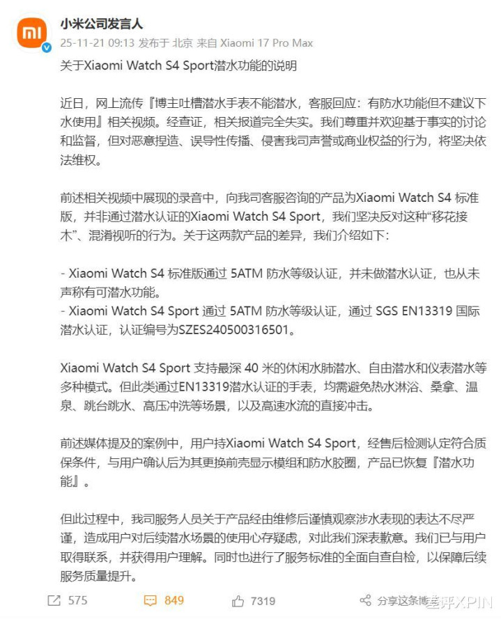 有些博主为了博眼球,把小米客服针对 Xiaomi Watch S4 标准版( 未做潜水认证 )给出的 “ 支持防水,但不建议下水 ” 这个回复,嫁接到了通过潜水认证的 Sport 版本头上,刻意带偏节奏。